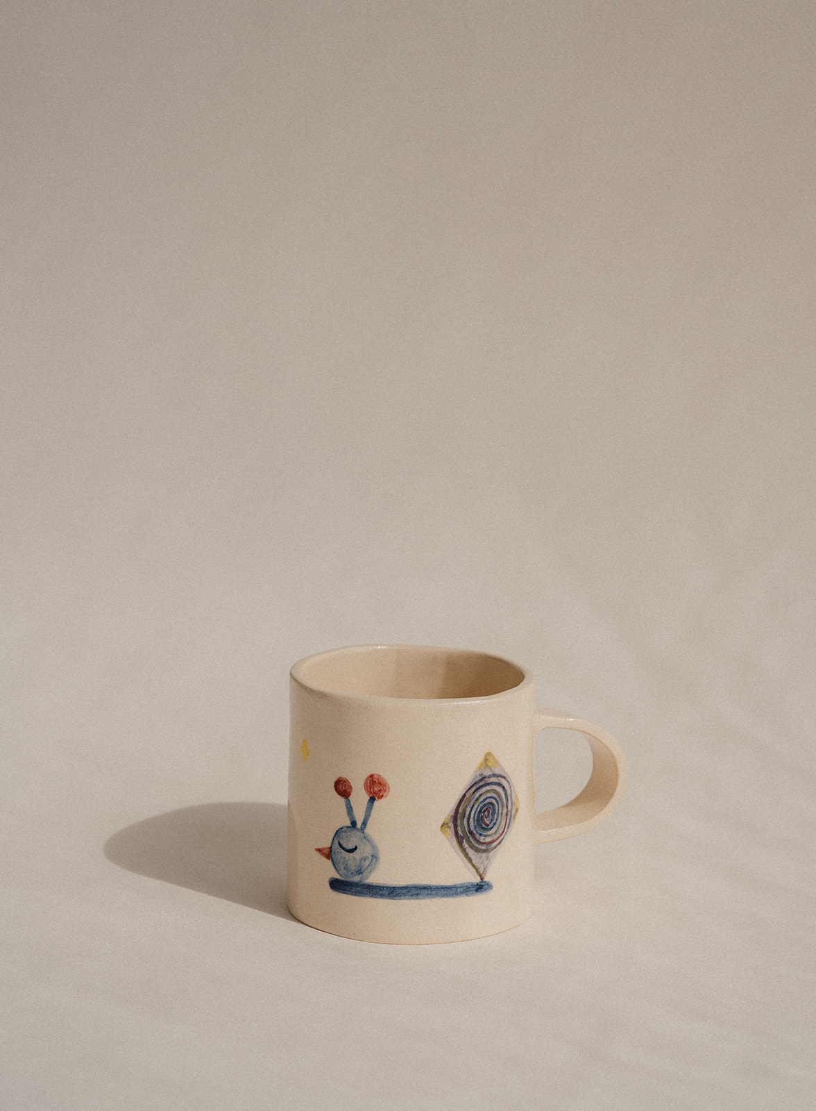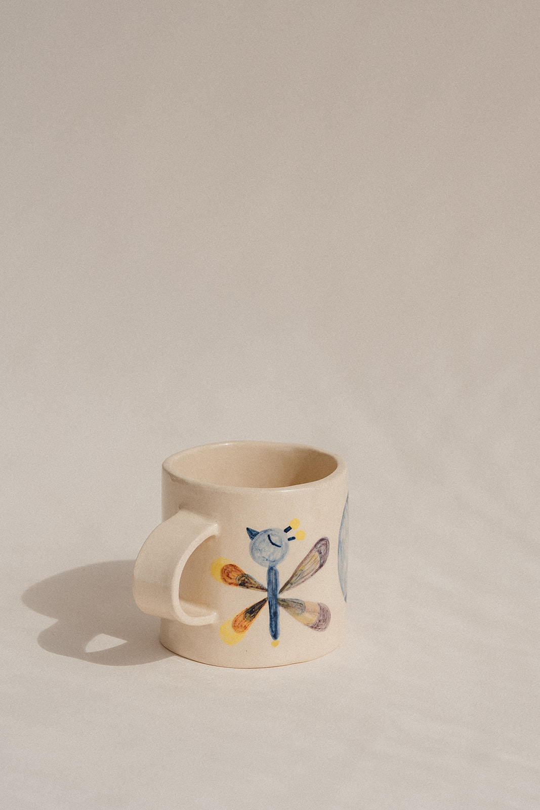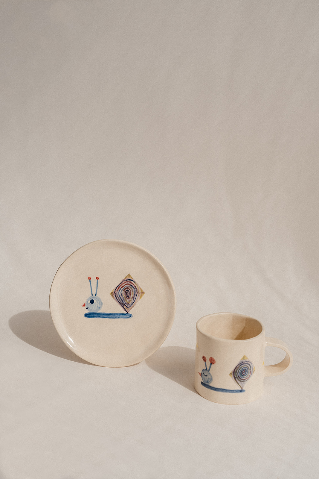 Tassa i plat modelats a mà i pintats amb engalba de colors.
