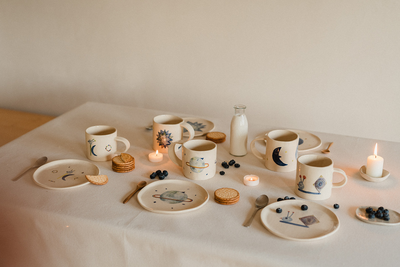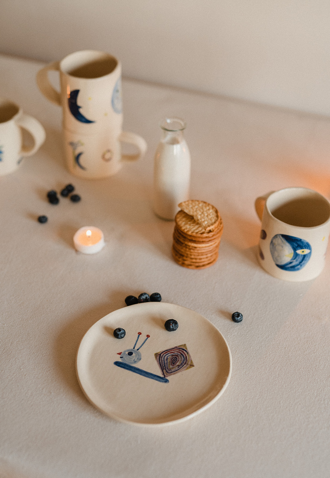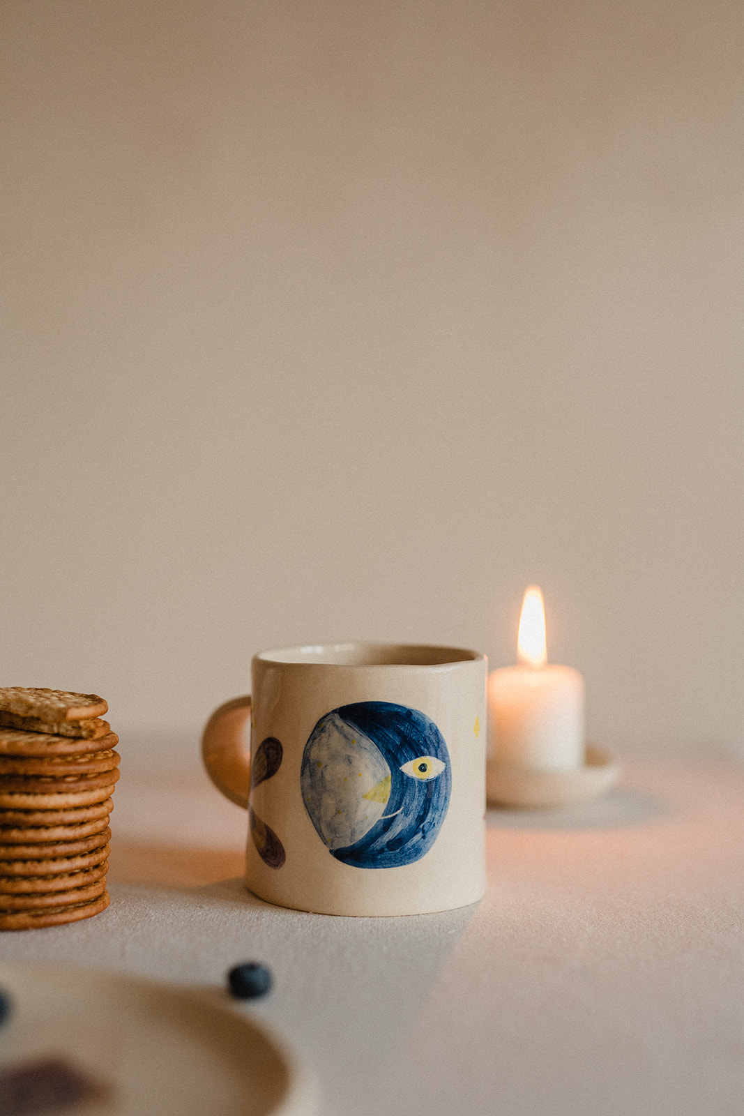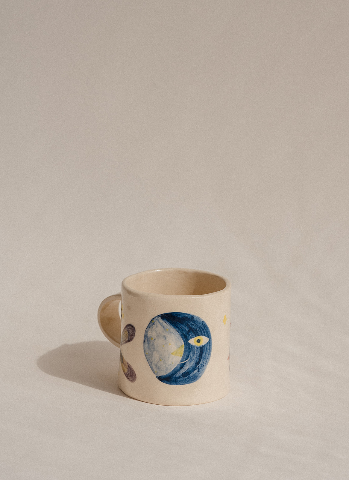 Tassa i plat modelats a mà i pintats amb engalba de colors.