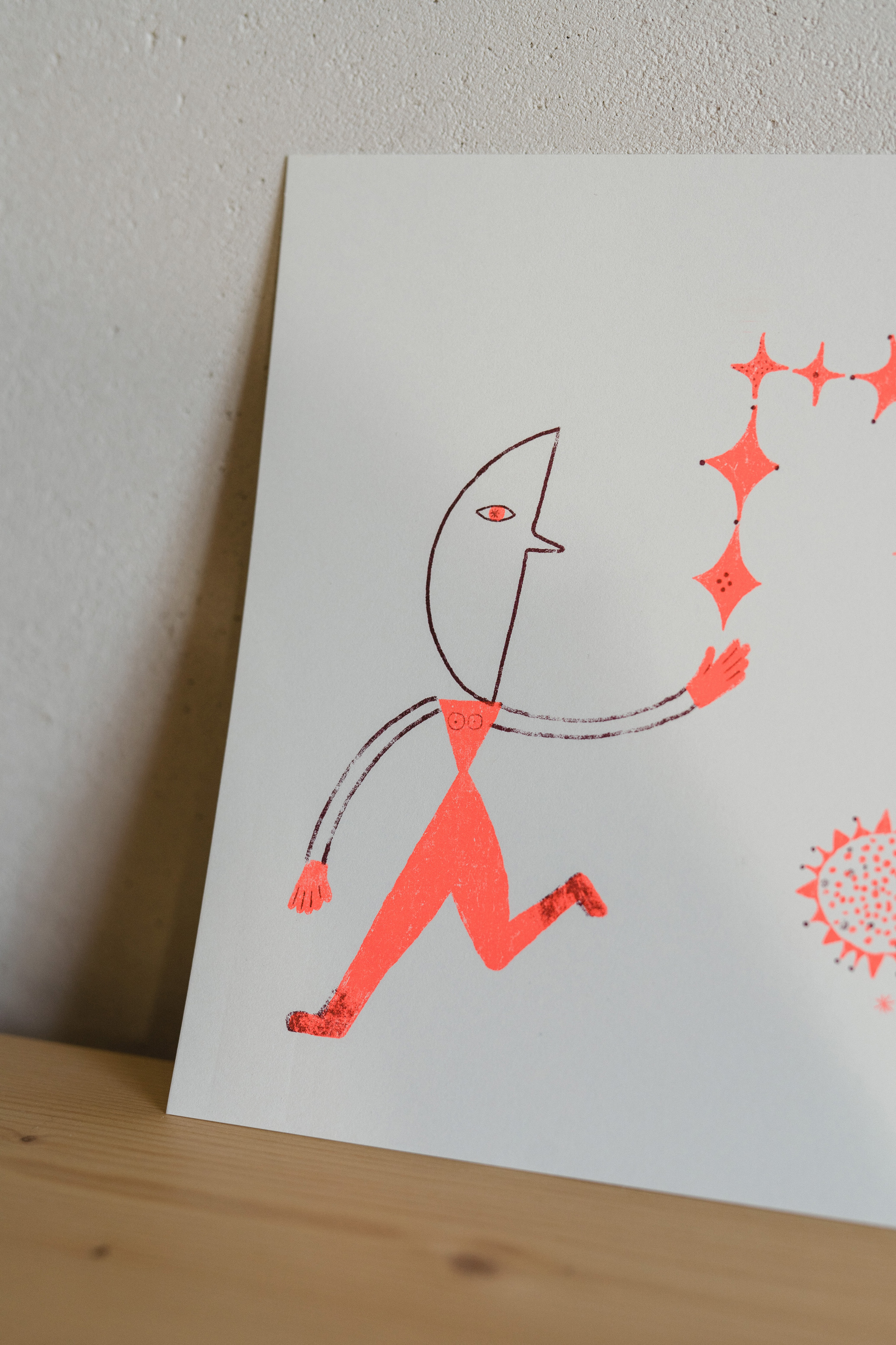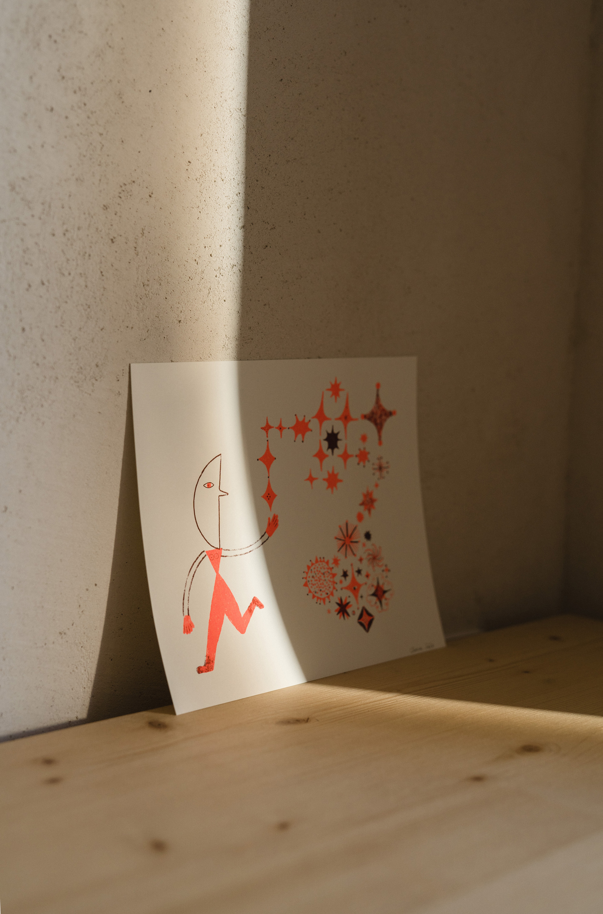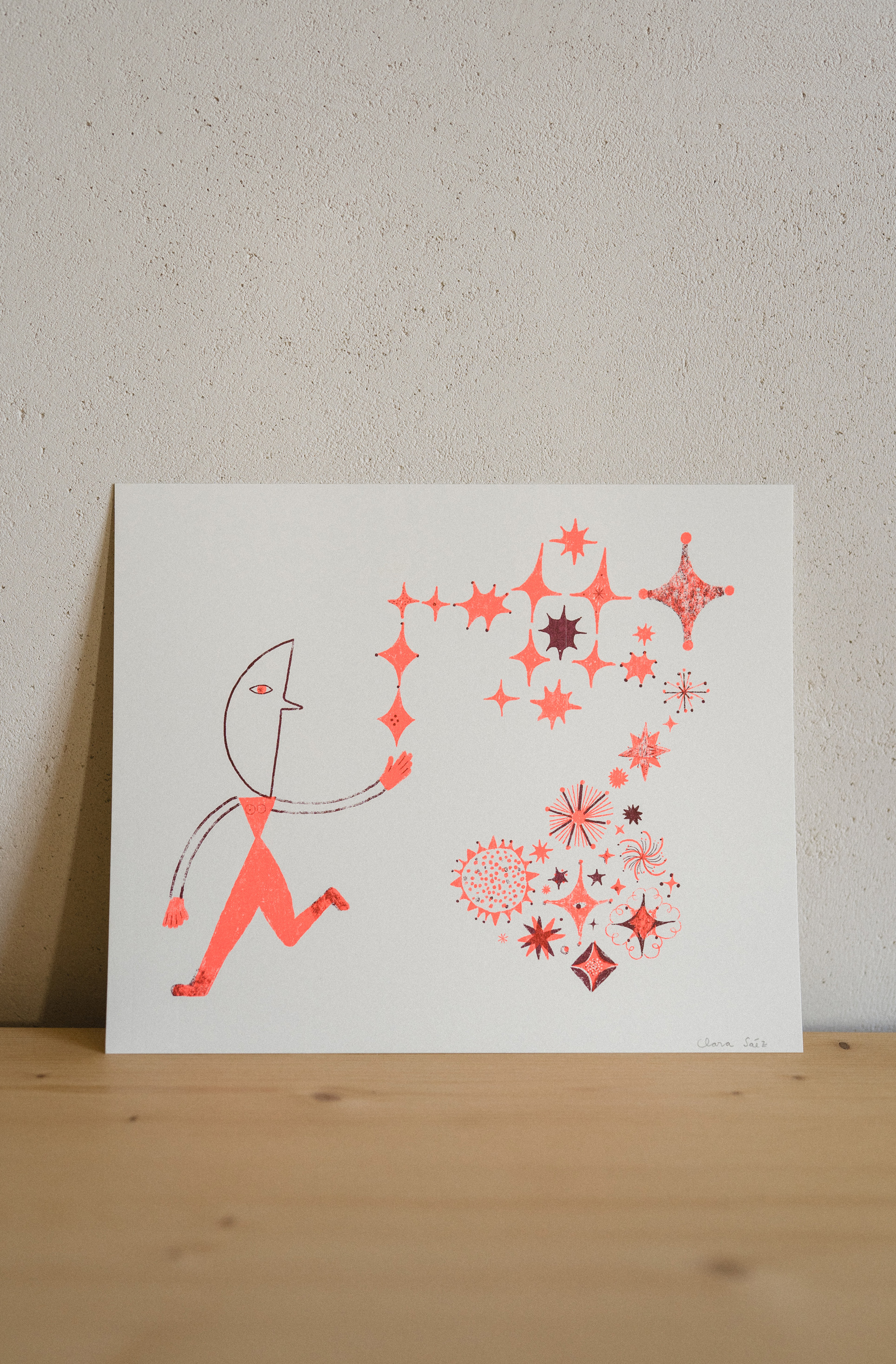 Luz 10 € Risografía 2021 Xarxa lluminosa per a cercle virtuós 23 x 19 cm Edixion Offset 250g 2 tintes; bordeus, taronja flúor Imprès en Do the Print Afegir a la cistella