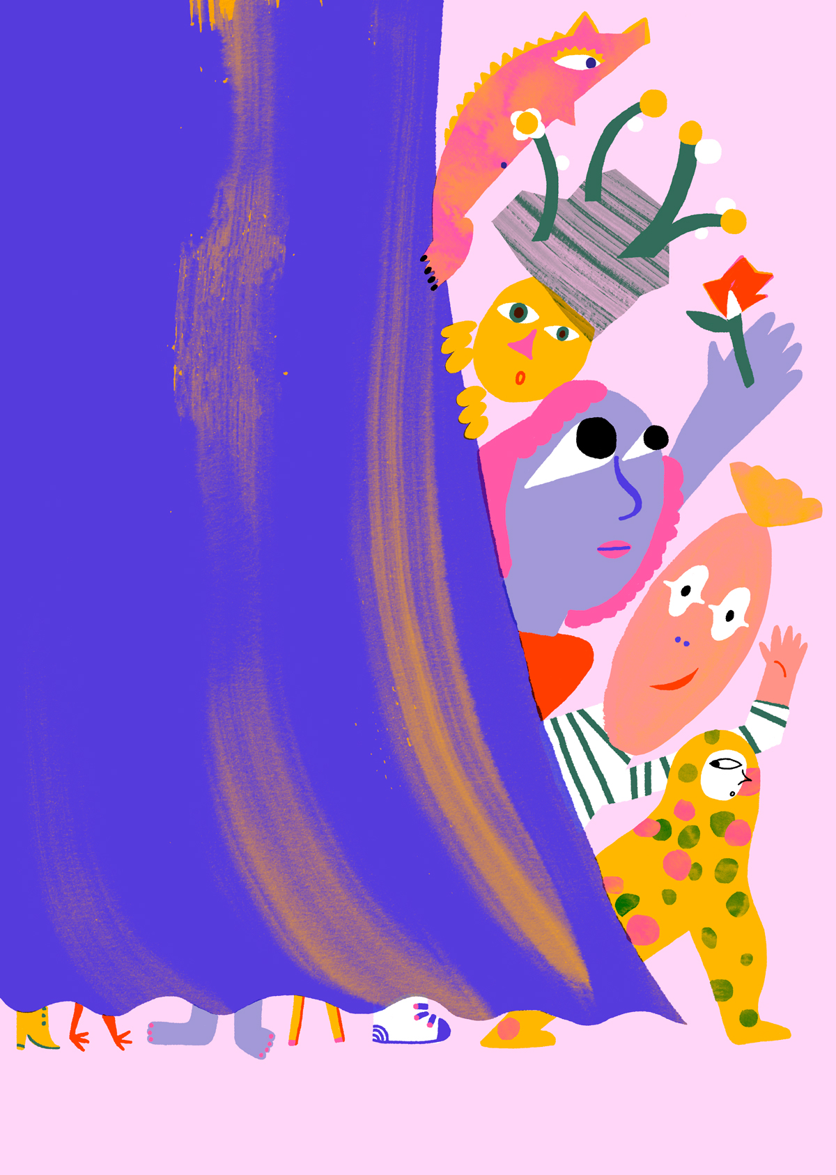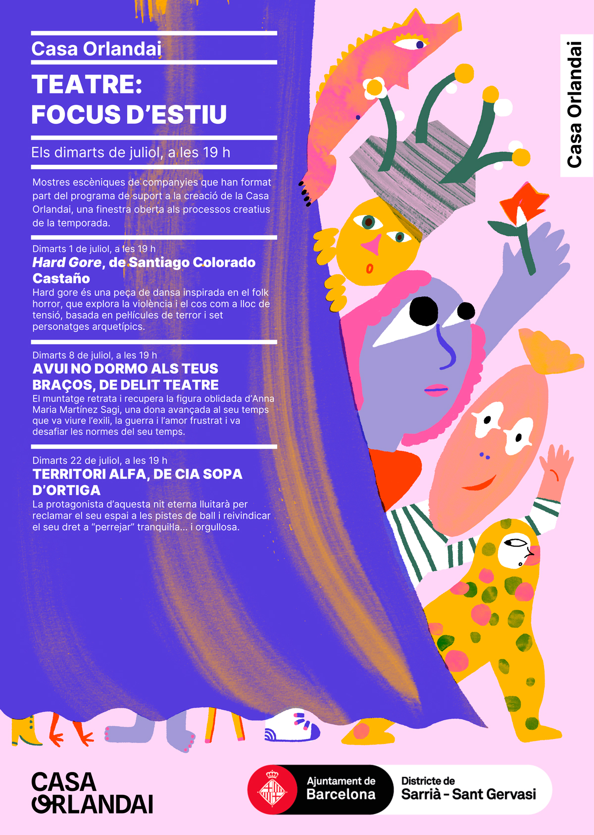 Personatges que estan a punt per sortir a escena pel cartell de la programació teatral d'estiu de la Casa Orlandai