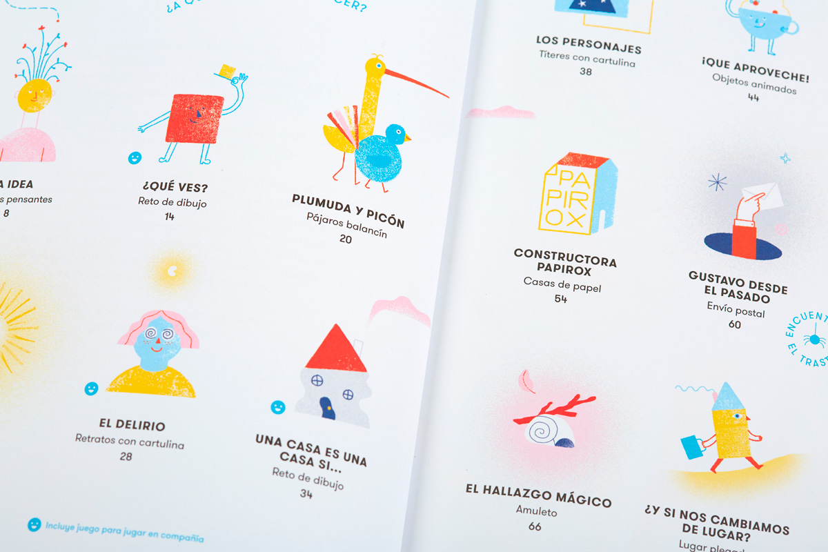 Proposem tres tipus d'activitats: unes més manipulatives i de construcció amb cartolines, altres centrades en el dibuix i per últim, unes propostes més màgiques i experiencials. Totes pensades, escrites i il·lustrades conjuntament amb Julia Abalde. Les fotografies corren a càrrec de Andrés Solla i la maquetació i disseny gràfic de Jordi Oms